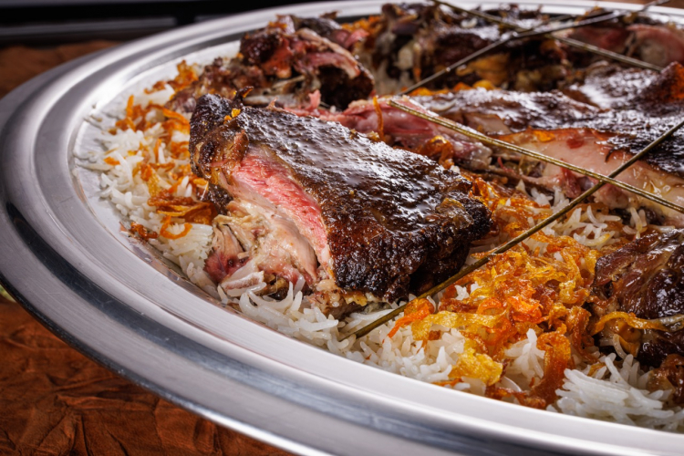 ربع ذبيحة تيس حنيذ مدخن على الحطب لمدة 6 ساعات يقدم على الطريقة الأمريكية 400 ريال (2550 سعرة حرارية)